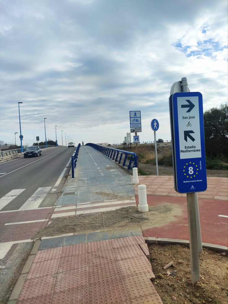Como iba diciendo, en mi paseo matinal observo y soy testigo de un hecho desagradable, en el puente de la desembocadura del rio Andarax, en donde termina el paseo marítimo y empieza el de la universidad, que por cierto es estrecho, han pintado un carril bici de color gris, que quiere decir que circulamos bicis y peatones, y que la prioridad la tienen los peatones, que las bicis debemos circular muy despacio y tener mucha precaución.